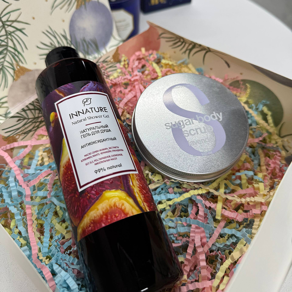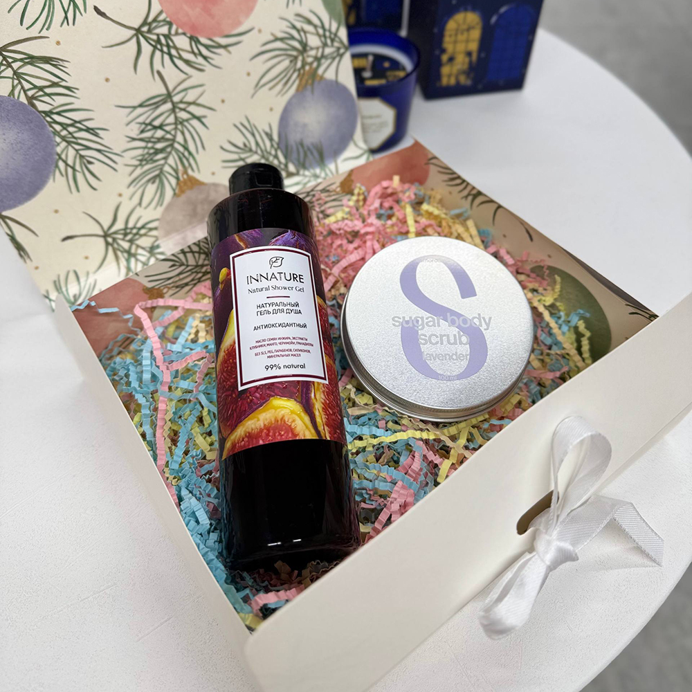 В набор входит: Скраб-желе для тела Лавандовый 100 гр Smorodina; Гель для душа "Антиоксидантный" Innature; Подарочная упаковка; Наша фирменная открытка.